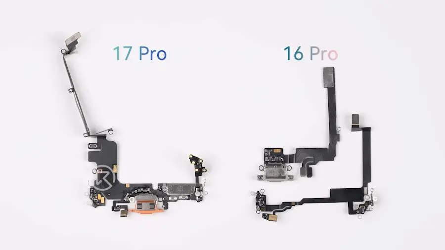 拆解iPhone 17 Pro 也发现音讯方面,顶部扬声器体积加大、底部排线设计调整,全面整合成单一模组。