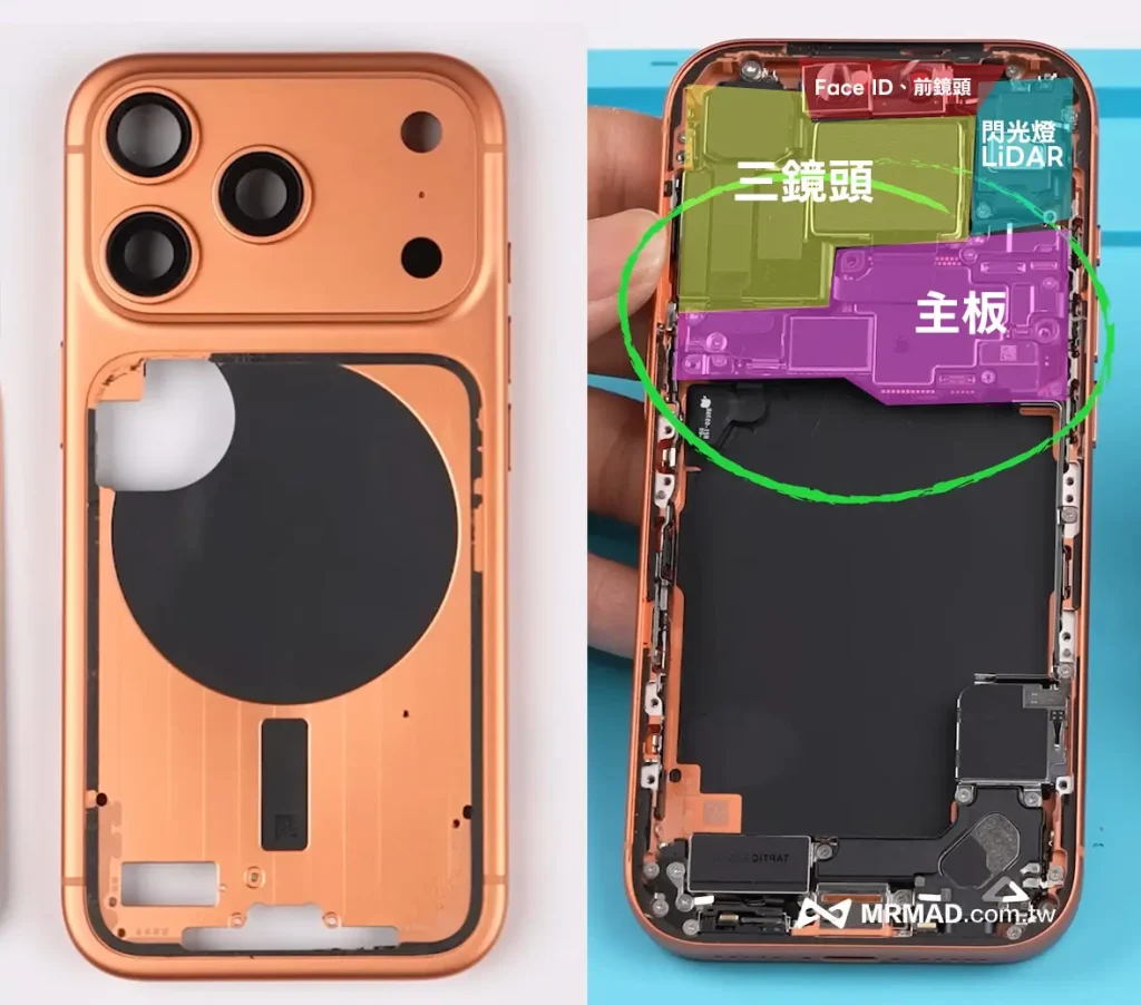 从拆解也能发现,这次主机板重要晶片都全集中在顶部区块,与iPhone Air 做法完全相同。底下就依照拆解图来标示出顶部区块塞入重要零组件,其中影响iPhone 17 Pro 主要厚度同样是三镜头模组,望远镜长焦CMOS 也占用更多,光是面积就占掉约主机板约三分之一。