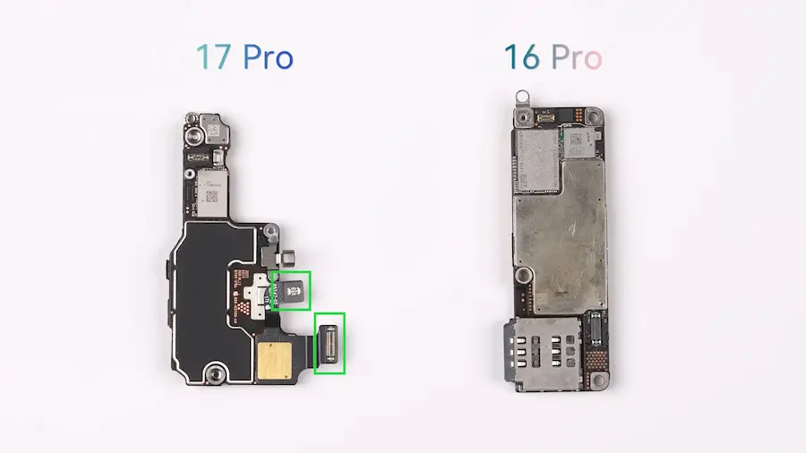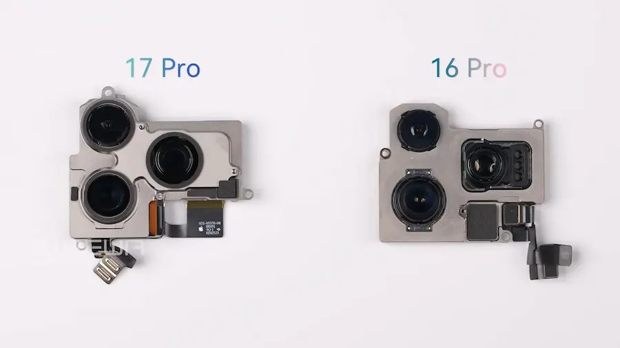 对于iPhone 相机影像系统一向是Pro 系列的重点,这次iPhone 17 Pro 在前后镜头升级幅度不小,与前代iPhone 16 Pro 相比,最明显是在传感器面积明显变得更大,不过这次排线采用更短和更精简设计。
